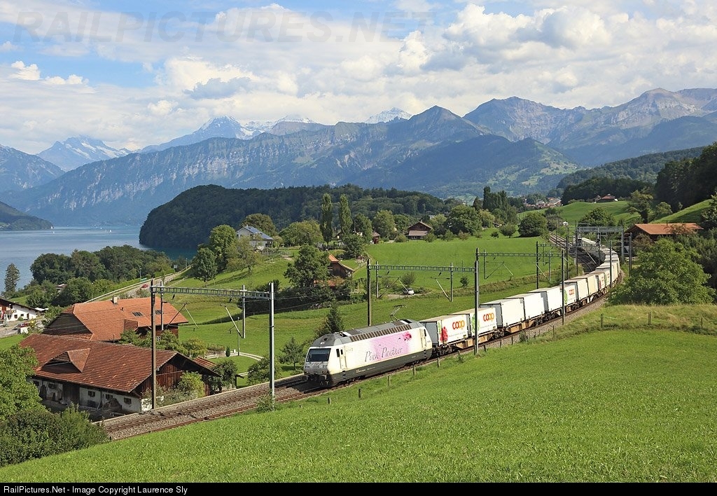 | 465 017 passes Einigen whilst working Railcare freight train 63680 from Brig to Niederbottigen, 23 Aug 2017 |