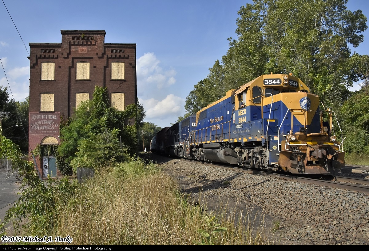 New England Central GP38 3844 leads Connecticut Southern train CSO-4 past the old Westfield Plate Company in Thompsonville.