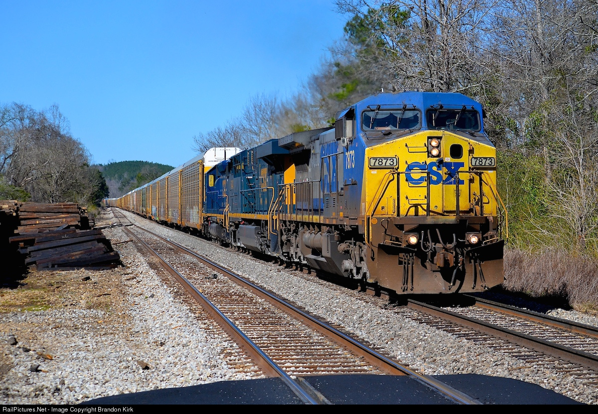 Automobiles hitch a ride south behind a fleet of CSX engines with a veteran from the '90s leading the way. Built in 1993, CSX #7873 pulls 90 cars of train Q237, which has been abolished since April. Shipping to Baldwin, FL as well, CSX Q231 now handles its work.