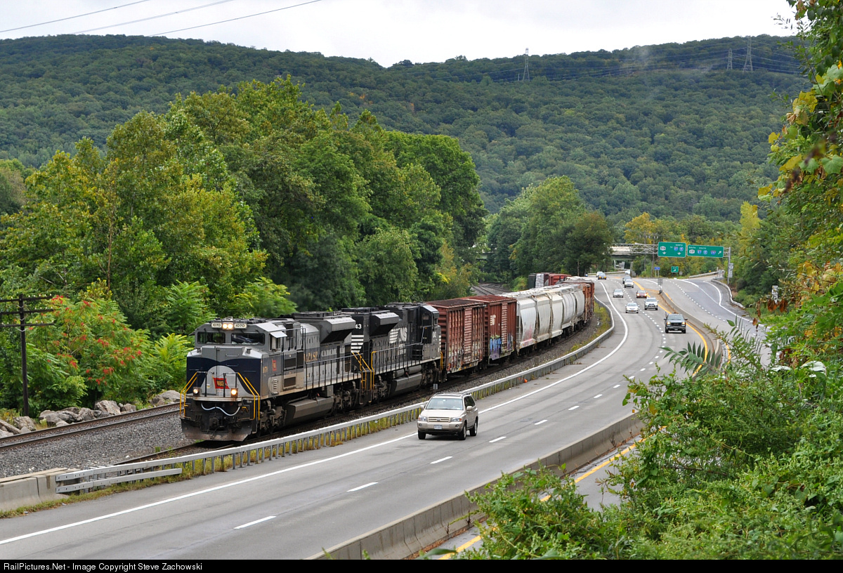 NS H70 proceeds Westbound alongside Route 17 as they head for Campbell Hall with a short freight bound for the Middletown & New Jersey. Normally nocturnal this special daylight edition of H70 featured NS 1070, the Wabash heritage unit leading the charge. |