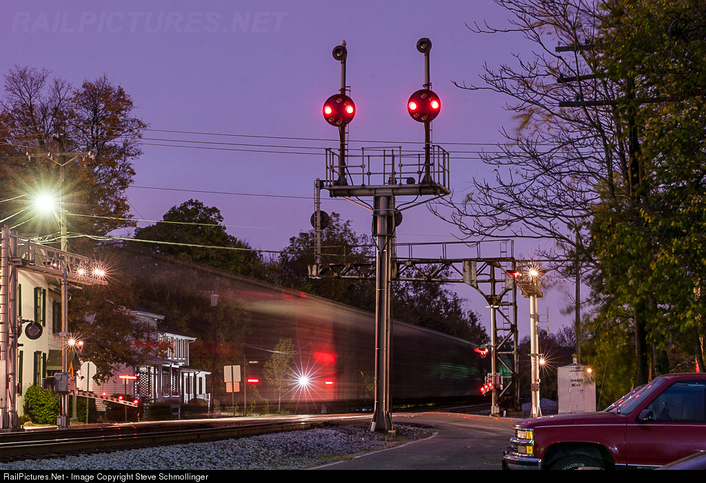 The tail end of a ghostly CSX vehicle train headed north passes the classic CPLs at Glendale.