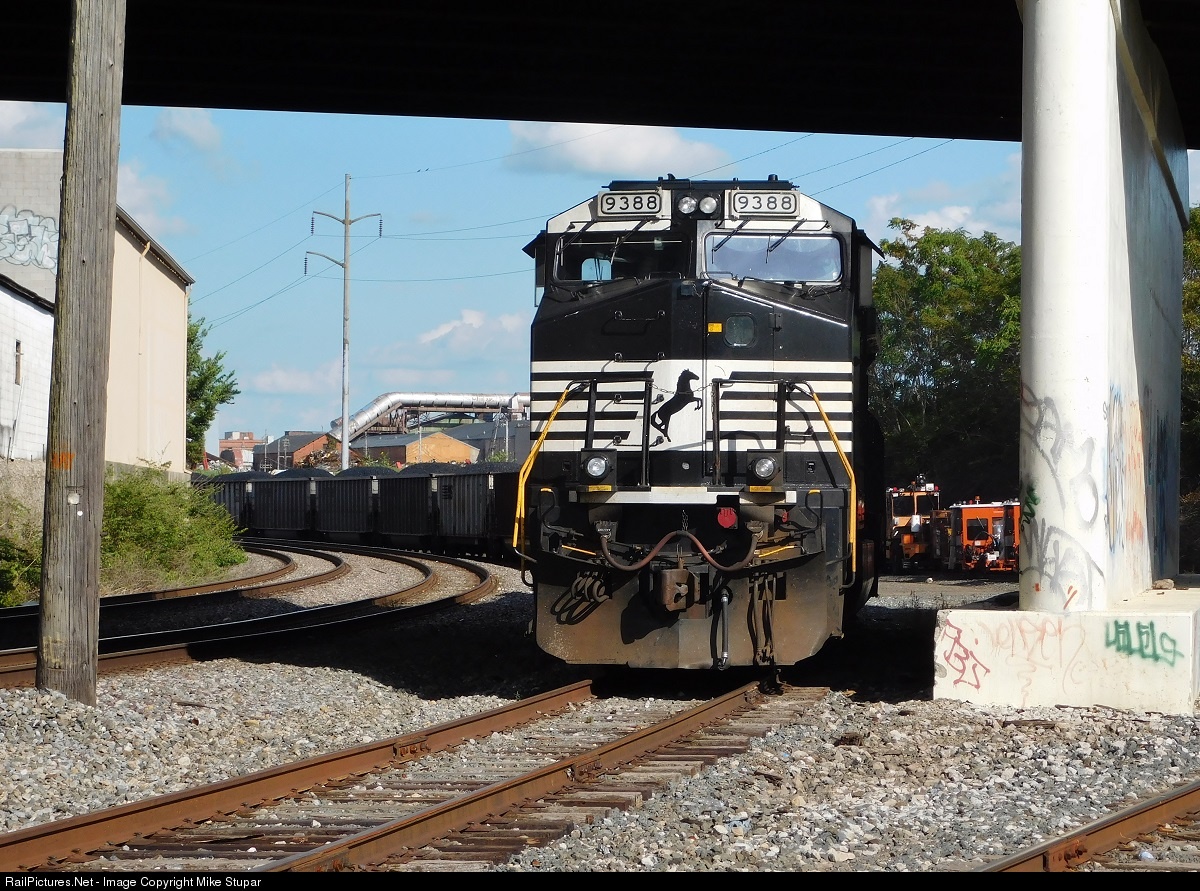 NS 9388 and coal train up from the West Virginia Secondary sit tied down under High Street on an August afternoon.