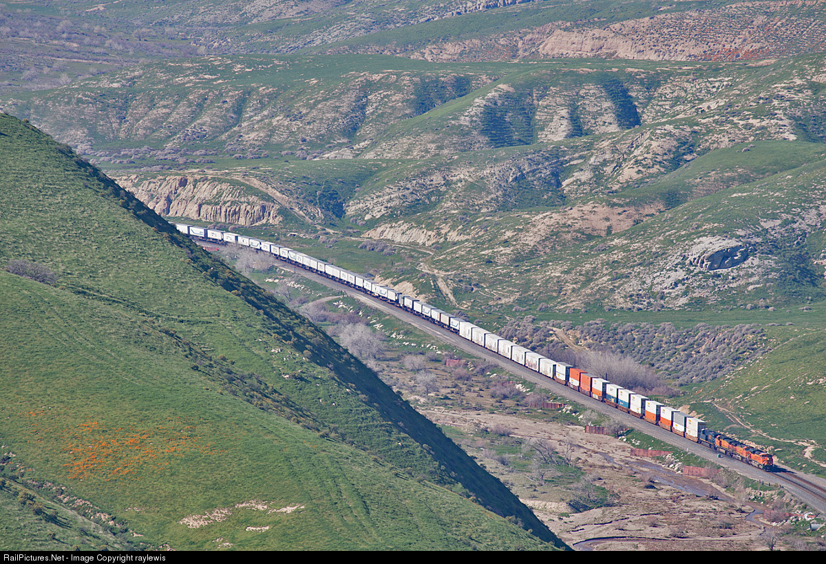 | View from high above Ilmon On a hazy but comfortable Feb afternoon a Southbound stack train led by BNSF 9061 climbs through Ilmon during Spring in California. The green hills popped up early this year as did some very sparse regions of poppy clusters as displayed in the left of the photo. |
