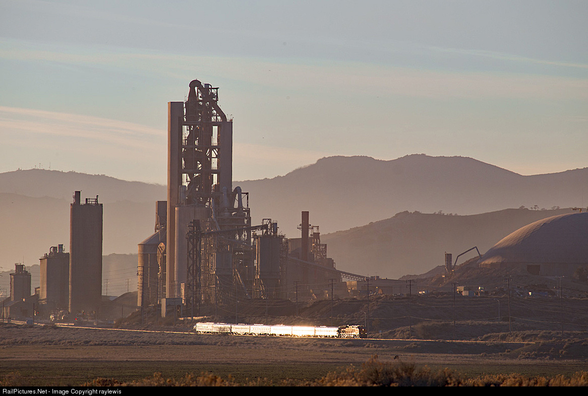 Nothing glints like a nice shiny train!On a hazy but comfortable Feb afternoon a surprise officer special ights up as it passes the famous Portland Cement Factory East of Tehachapi.