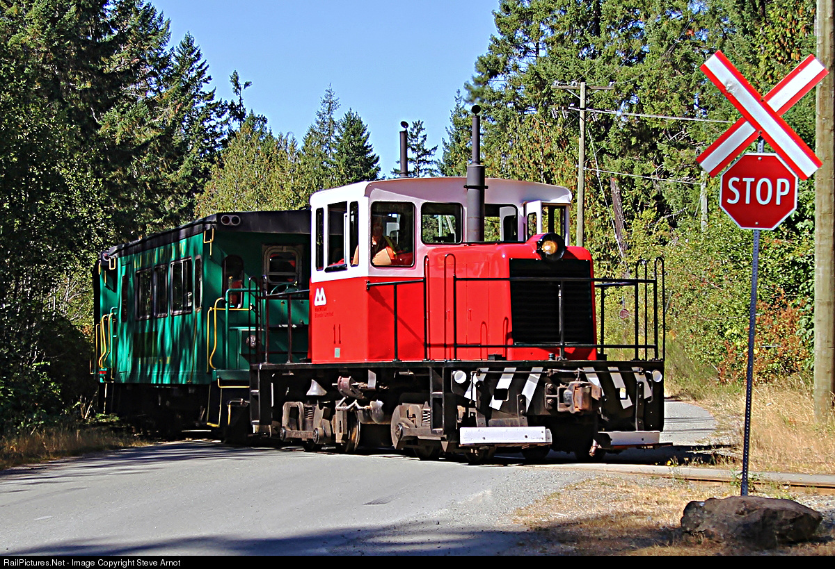 | Alberni Pacific's former MacMillan Bloedel GE 45 ton #11 crosses Smith Road as it arrives at the McLean Mill National Historic Site in Port Alberni. This unit entered service in 1942 as US Army #7089 and then became US Navy #65-00568 in 1951. It was used by MacMillan Bloedel from 1975 until it was retired in 1987. |
