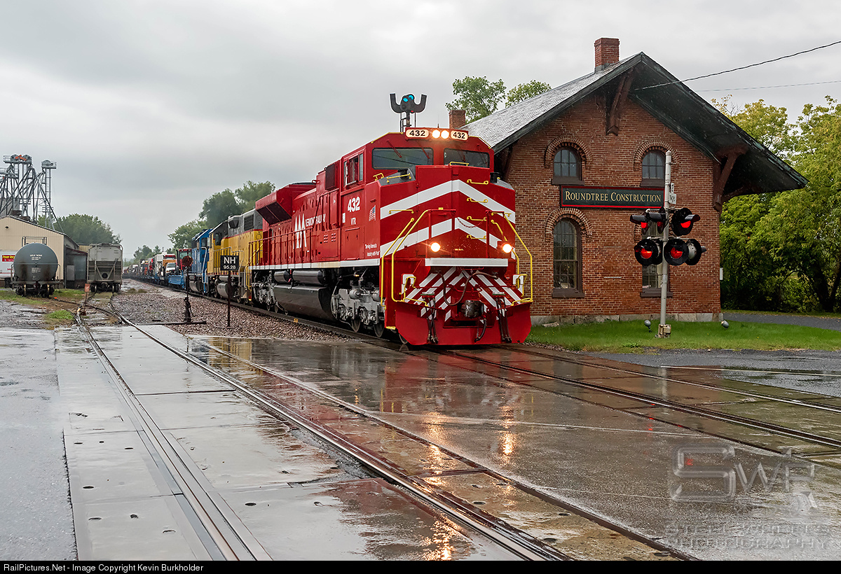 Two firsts for the Vermont Railway on September 5, as the first southbound move of the Strates Carnival Train departs Burlington, Vermont, behind Vermont Railway SD70M-2 432, which is making its first lead trip on the Northern Subdivision as seen southbound in steady rain at New Haven, Vermont..