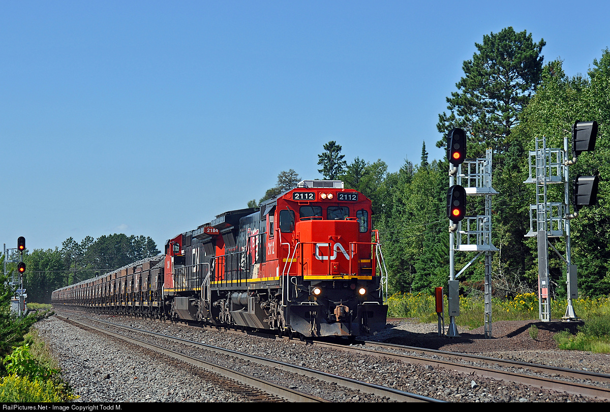 CN 2112 leads a raw ore train from Largo to Fairlane or from Cleveland Cliffs Thunderbird mine doen to the plant where this rock will be turned into taconite pellets for the steel industry.