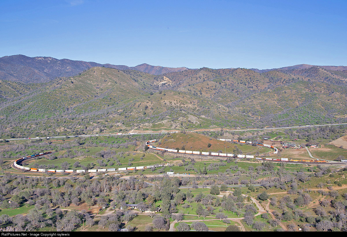 | Springtime on the Loop? It sure looks like it, but technically its still Winter. In 2016 the hills turned green early. This was just about the last angle of the loop that I haven't shot in all my years on Tehachapi. In 2016 BNSF 5458 is at the top of the loop while its rear end DPUs are still a fair distance from the portal of tunnel #9. |