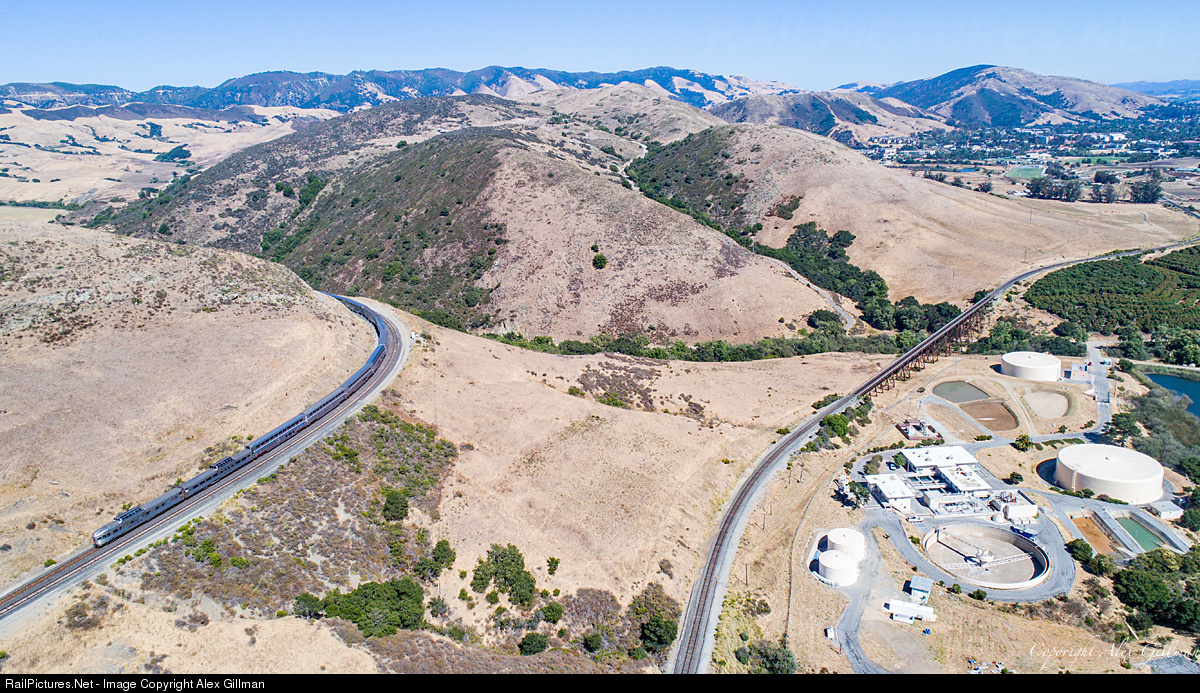| Bringing up the markers of today's northbound Coast Starlight, the private passenger cars "Silver Lariat" and "Silver Solarium" of CB&Q heritage show the stark contrast between the tracks they're seen riding above through Chorro and those down below on the Stenner Creek Trestle - the location the train was at only minutes ago before tackling the Gold Tree Horseshoe Curve directly behind the photographer. |