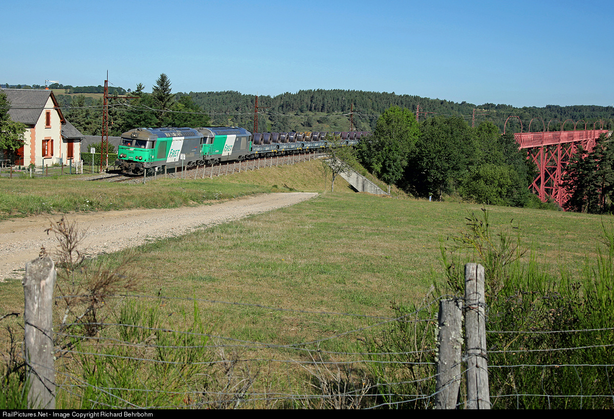 | BB 67579 and 67503 have just crossed the viaduct of Garabit. The locomotives are pulling a freight train Clermont-Ferrand - Saint-Chély-d'Apcher, loaded with sheet metal coils. |