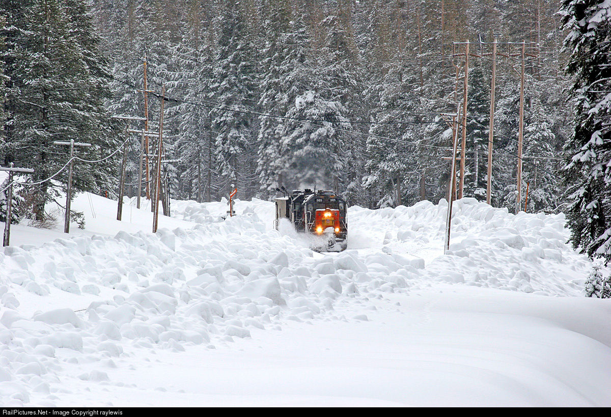In March of 2006 the SP was barely hanging on...at least on Donner. In this scene former SP 4822 is wearing the UP reporting marks topped off with patches, now serving as the UP 585. In this scene the work from the spreader has a fresh coat of snow building the banks on each side of the tracks.