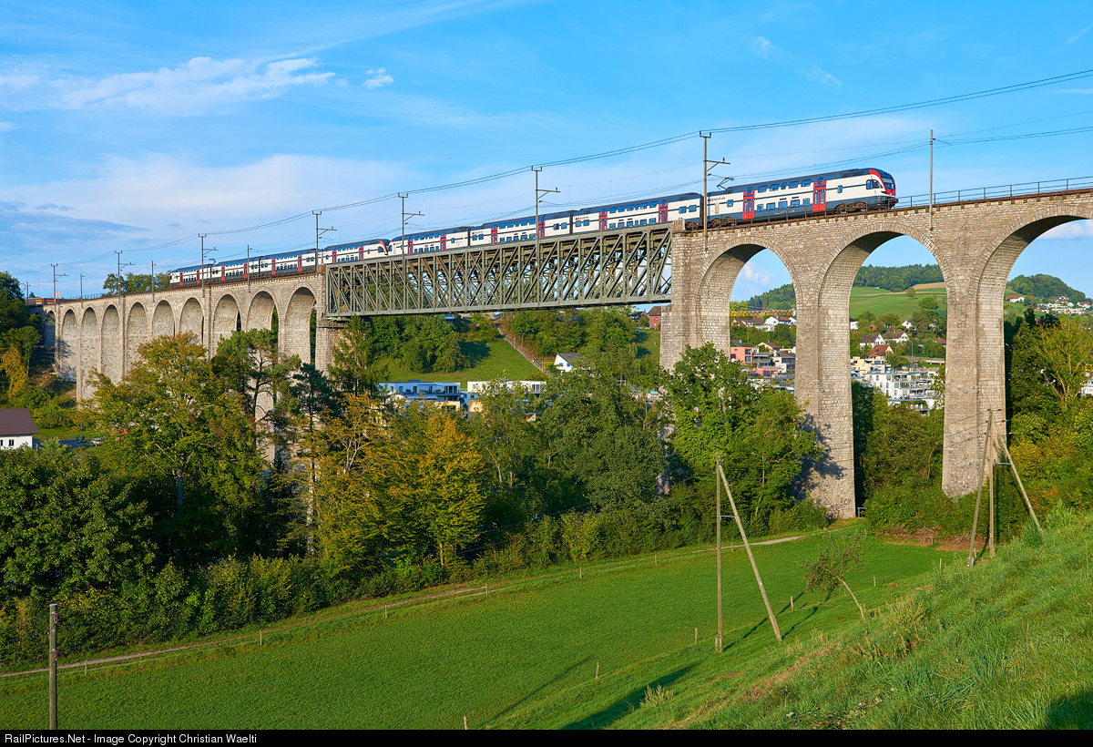 | RegioExpress 4933 from Schaffhausen to Zürich HB with SBB (Swiss Federal Railways) 4-Car EMUs RABe 511 121 and RABe 511 112 crossing the Rhine River between Hüntwangen-Wil and Eglisau. |