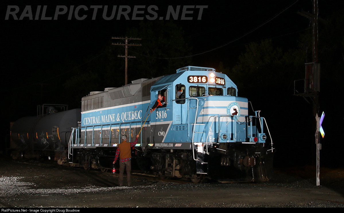During the annual "Glory Days of Railroading" festival, the Central Maine & Quebec 3816 sits tied down in the yard on display. During the night photo shoot actors were used to replicate the engineer getting orders.