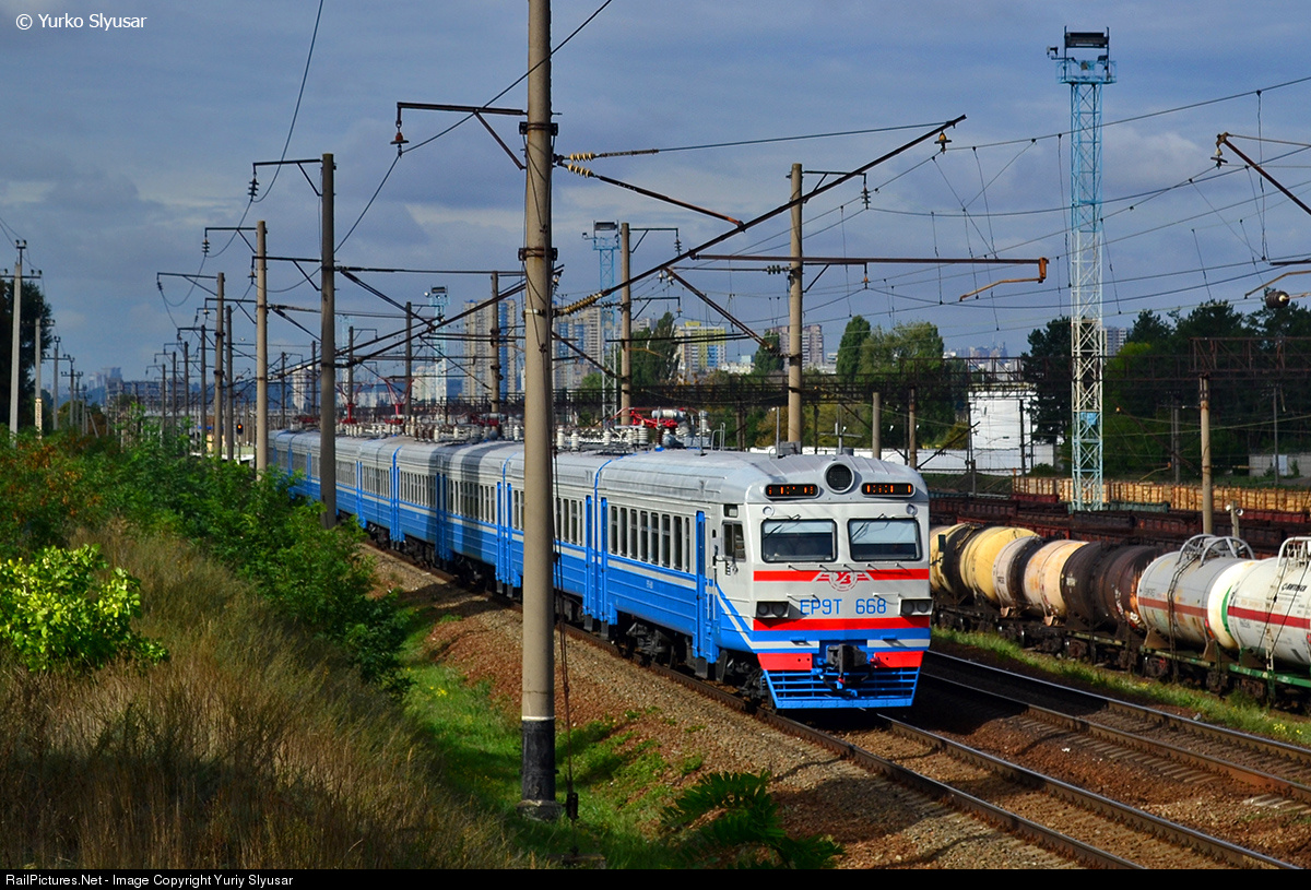 The EMU set ER9T-668 enroute #818 Fastiv-I - Vorozhba leads on Darnytsya - Post 837 km stretch (between platforms Darnytsya-depot and DVRZ). Recently this EMU was repaired by plant KEVRZ (Kyiv electric car repair plant). This EMU set built by plant RVR (Rīgas Vagonbūves rūpnīca) in November, 1988, and have factory type (62-289). And first was registered to depot TCH-8 Fastiv-Motorgorvagonnyi (now RPCH-8 Fastiv-Motorgorvagonnyi), then in July, 1989 this EMU was transferred to the depot TCH-10 Chernigiv (now RPCH-10 Chernigiv).