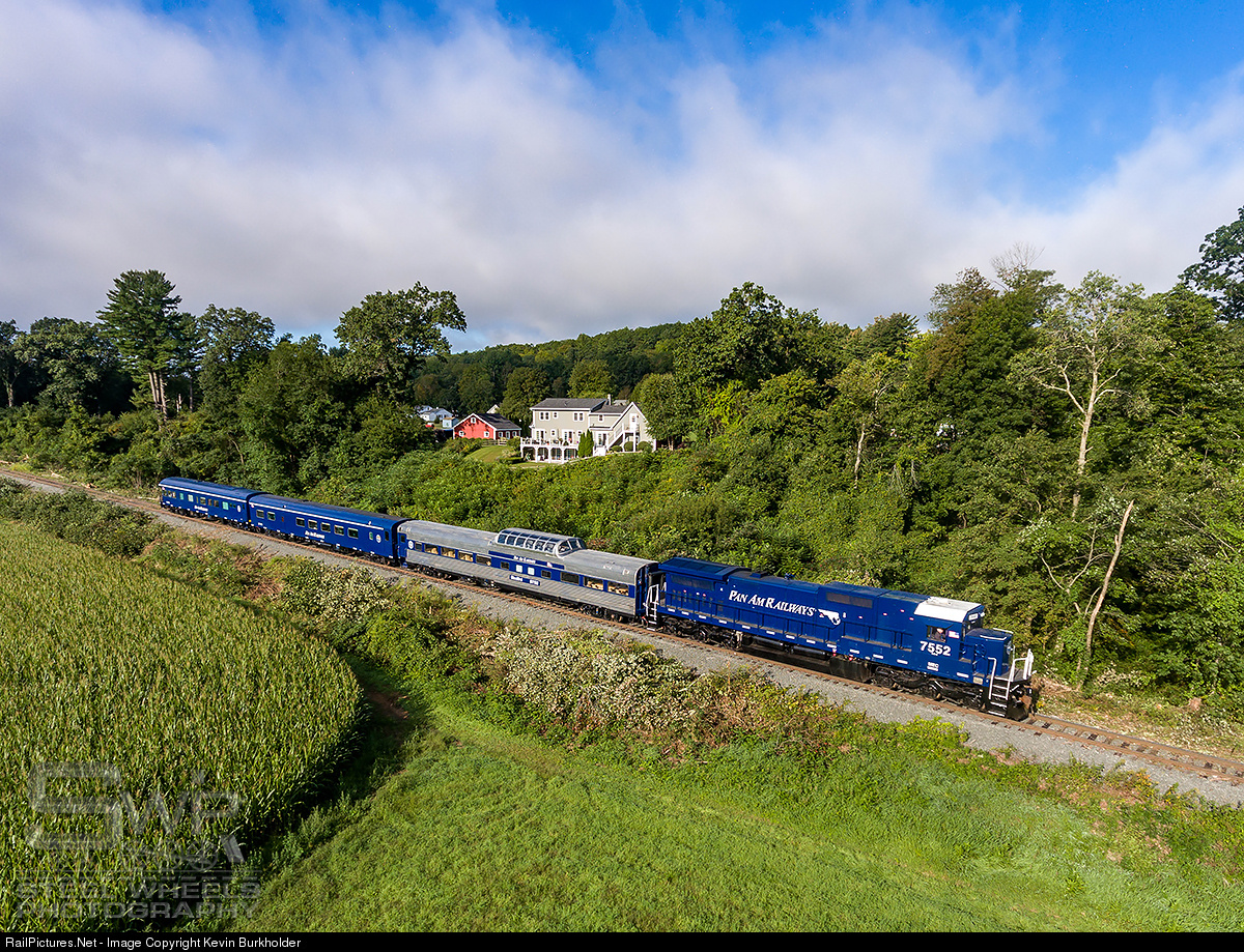 Pan Am Railways' first repainted ex-CSXT C40-8 #7552 leads a three-car office car special train, OCS-08, through East Northfield, Massachusetts on the way to White River Junction, Vermont's annual Glory Days of the Railroad Festival on September 9 and 10.