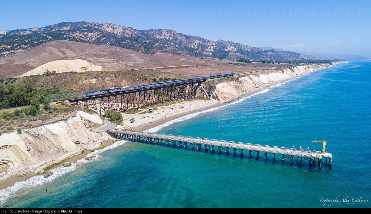 Skirting the Pacific Ocean on a beautiful afternoon along the west coast, Amtrak 14, the northbound Coast Starlight, races across the 811-foot long trestle at Gaviota as it heads for its next station stop of San luis Obispo.