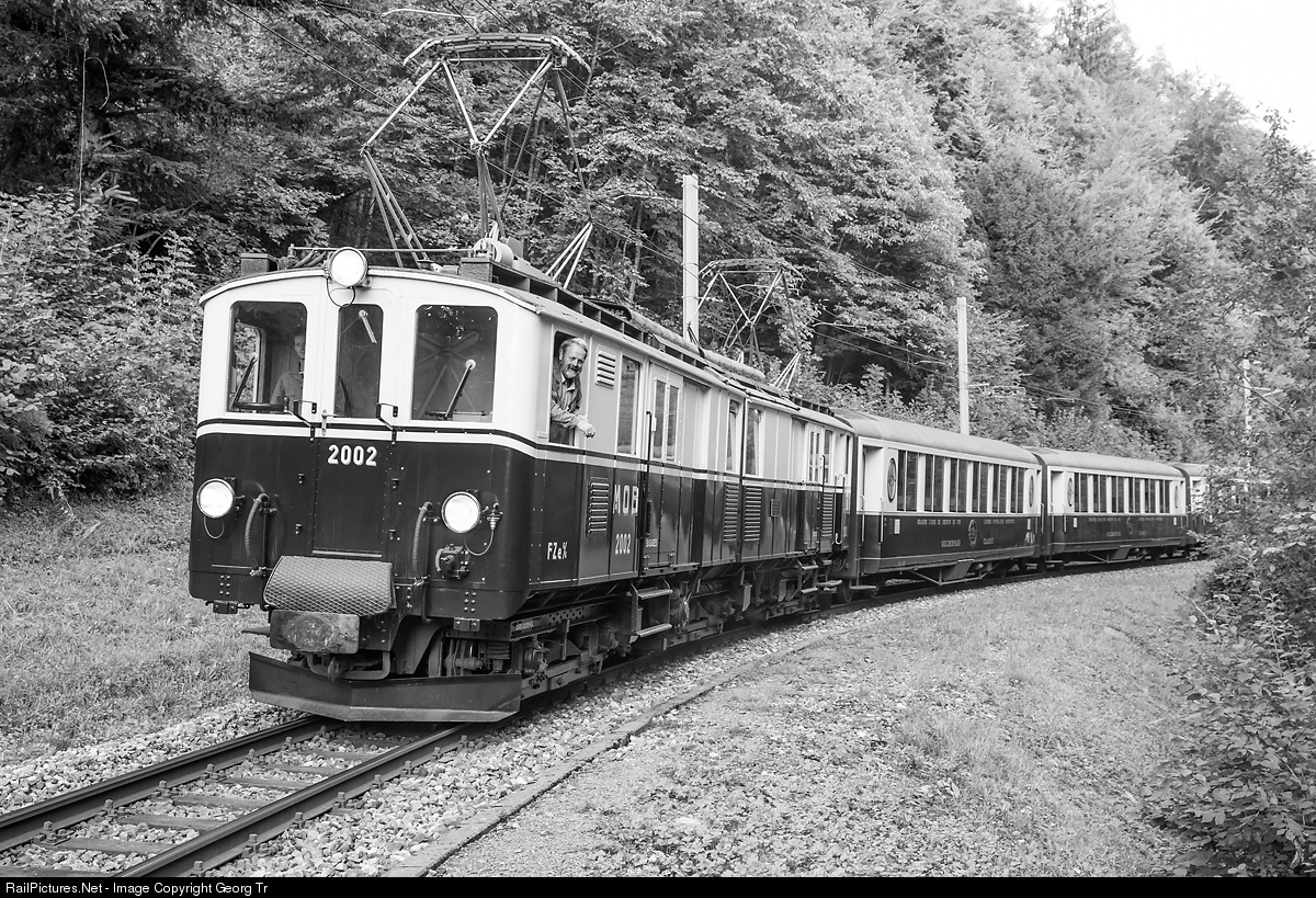 Heavy articulated railcar with baggage and mail compartment FZe 6/6 # 2002 of the Blonay-Chamby Railroad Museum (BC) with a GOLDEN MOUNTAIN PULLMAN EXPRESS on the MOB line between Sendy-Sollard and Chamby. This sixaxle 810 kW railcar was built by SIG and BBC in 1933 for the Montreux-Oberland-Bernois (MOB), to pull the Golden Mountain Pullman Express between Montreux and Zweisimmen. This train was introduced in may 1931, but cancelled already in the autumn of the same year because of the world economy crisis and lack of passengers. So in fact this railcar never pulled the timetabled Pullman Express, but there were made some publicity photos in the 1930' with this composition. In the evening of the 8th september 2017, such a train was arranged for photographers by the MOB (4 Pullman cars) and the Blonay-Chamby (railcar FZe 6/6). The railcar # 2002 is running for the BC since 2008 and is beautyfully restored. The 4 Cars of the MOB are not original, but modern rebuilts in the appearance of the cars from the 1930'.
