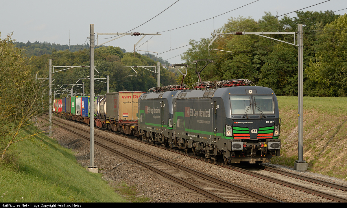 | SBB Cargo 193 257 & 258 (both leased from ELL) head southbound intermodal 40961 through Jestetten area. This train was diverted due to the mainline closure between Rastatt and Baden-Baden. |