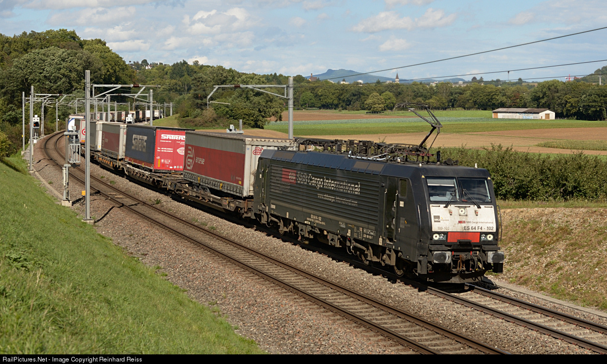 | SBB Cargo 189 102 heads southbound intermodal 40973 through Jestetten area. This train was diverted due to the mainline closure between Rastatt and Baden-Baden. |