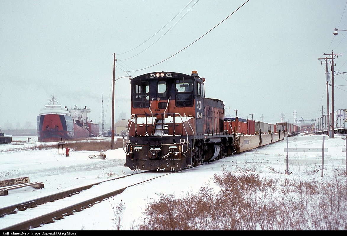 Soo Line 1548 (ex-Milwaukee Road) switches Jones Island in Milwaukee, WI in January of 1993. Several boats are in the harbor for winter lay-up, including the Arthur Anderson, the boat that followed the Edmund Fitzgerald the night she sank.