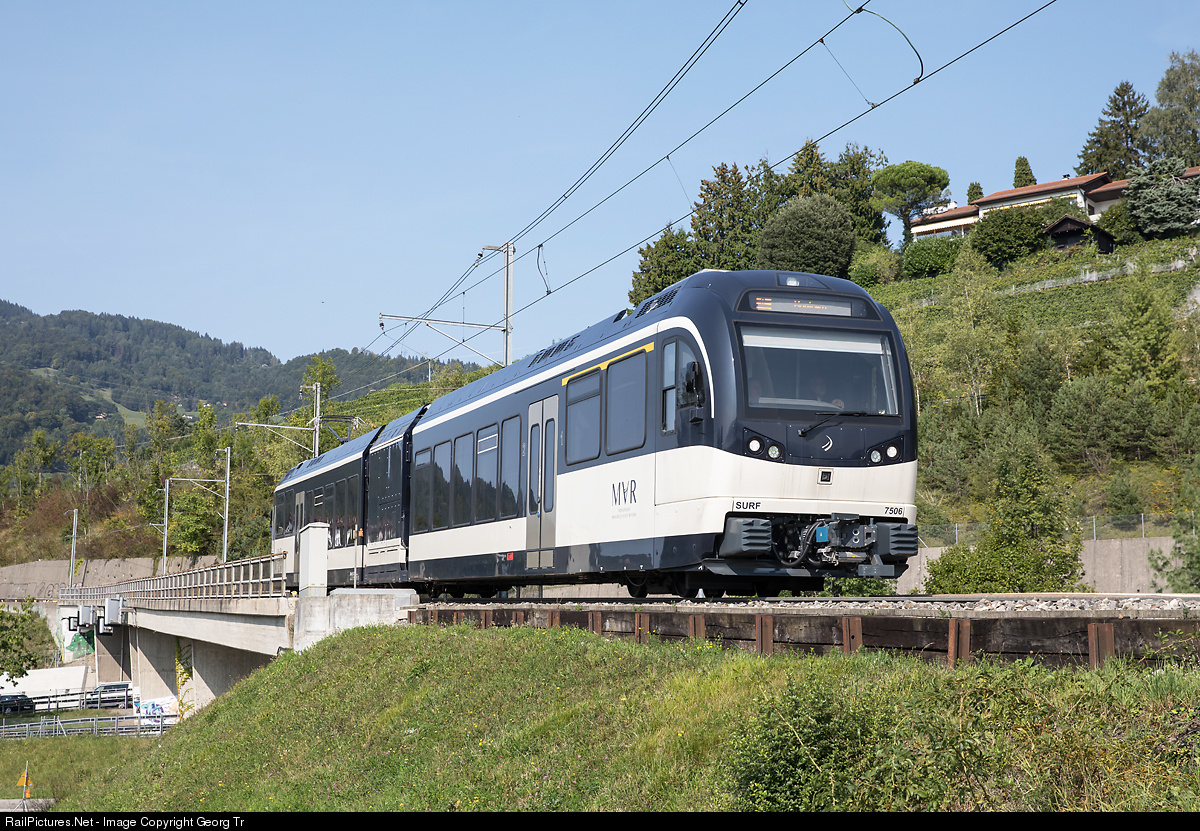 | Articulated lowfloor cogwheel train ABeh 2/6 "SURF" (Série Unifiée Romande pour réseau Ferré métrique/ Unified series for the metrique rail network in the french speaking part of Switzerland ) # 7506 of the MVR (Transports Montreux-Vevey-Riviera) is running as regional train 2345 of the MOB from Fontanivent to Montreux. |