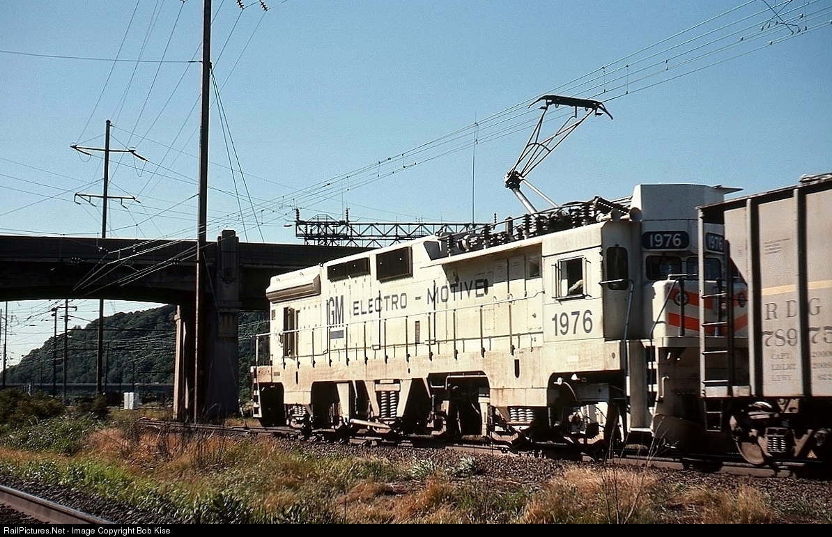 EMD/ASEA's one-of-a-kind 10,000 hp GM10B heads off into the sunset, with a westbound on the Enola Branch. The train is about to pass under the 1930-built Art Deco Columbia-Wrightsville Bridge, which carried US Route 30 (PA Route 462 today) across the Susquehanna River. A Harrisburg-based hostler said that road crews told him that when the 1976 was running long-hood forward (as seen here) it was like riding a boat in a storm.