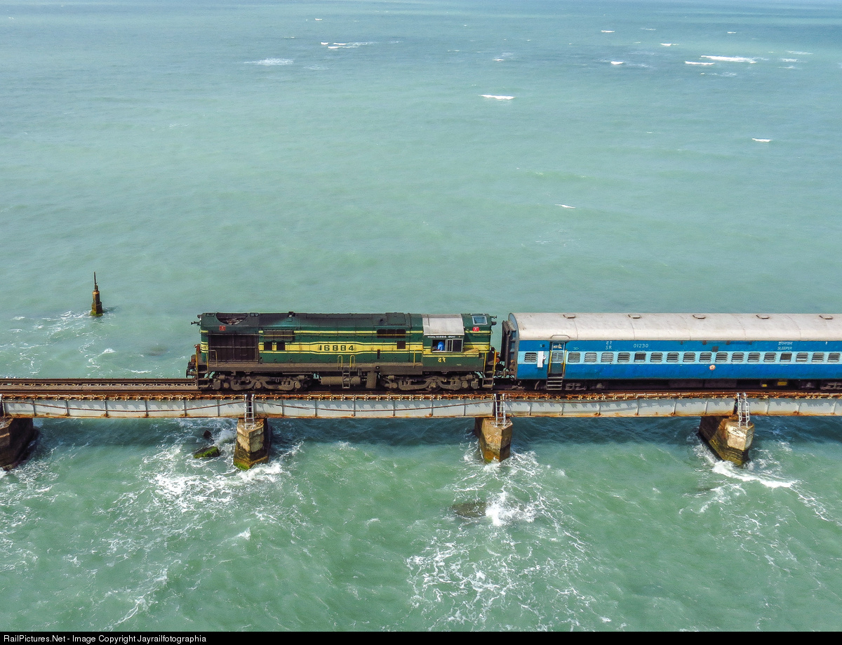 An old ALCO of WDM-2 class from PONMALAI shed slowly crossing Bay of Bengal to mainland with Tiruchirapalli Jn bound passenger train