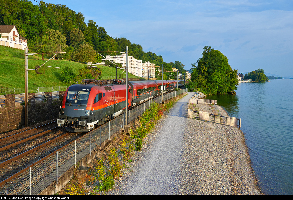 ÖBB "Taurus" 1116 221 guides the early morning eastbound "Railjet" RJ 161 from Zürich HB (Zurich Main Station) to Wien Westbahnhof (Vienna West Station) around the Shores of Lake Zurich between Wädenswil and Richterswil.