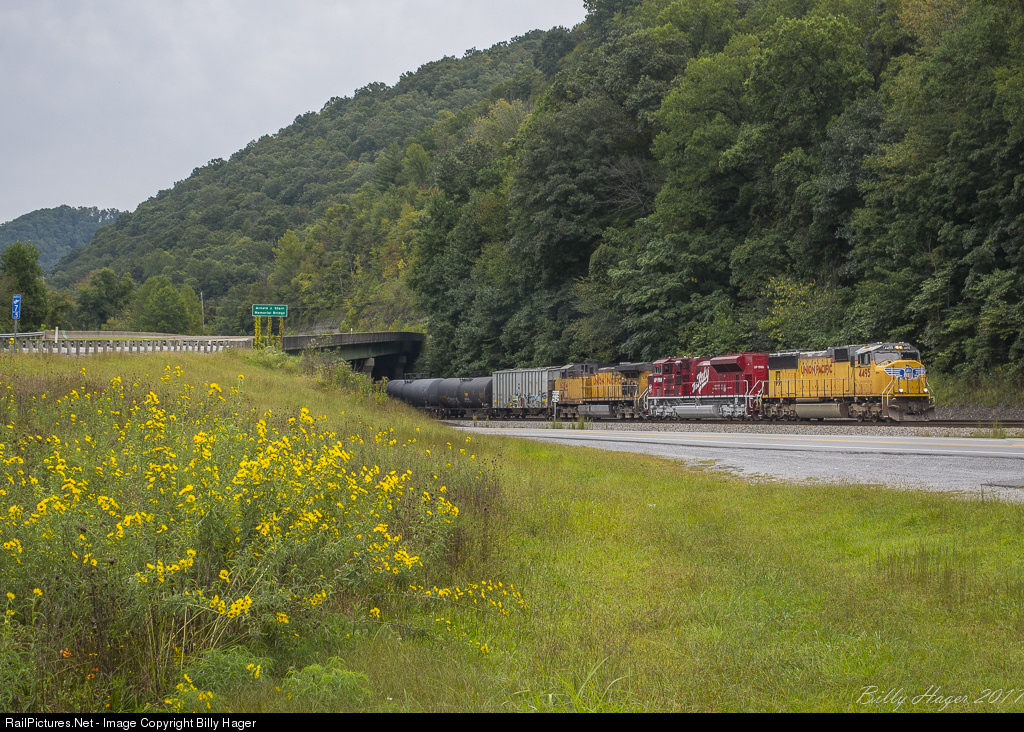 | With a trio of UP power, 64W passes under US 119 at Millers Creek, a few miles West of Williamson. |