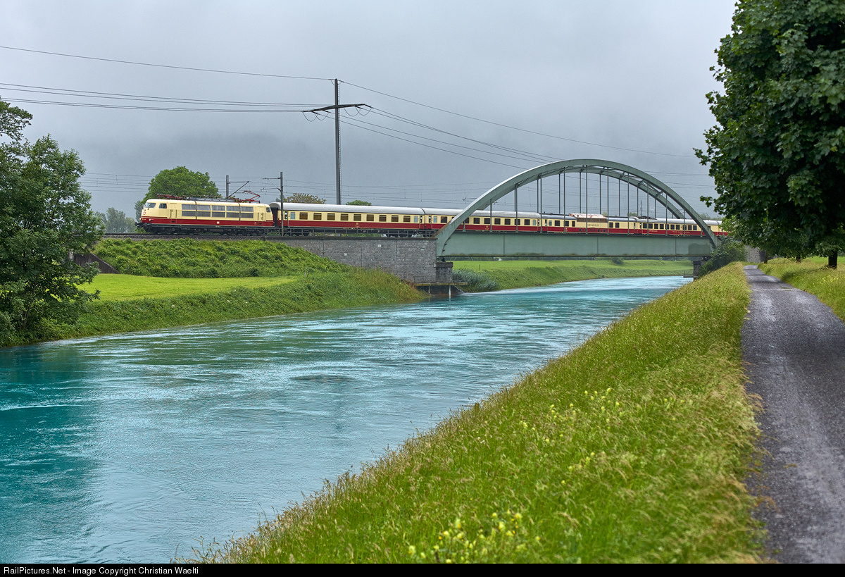 | DB 103 184 on the point of a "Rheingold" charter crossing the Linth Canal between Ziegelbrücke and Weesen. Passenger Extra 33047 from Basel Badischer Bahnhof to Landquart. |