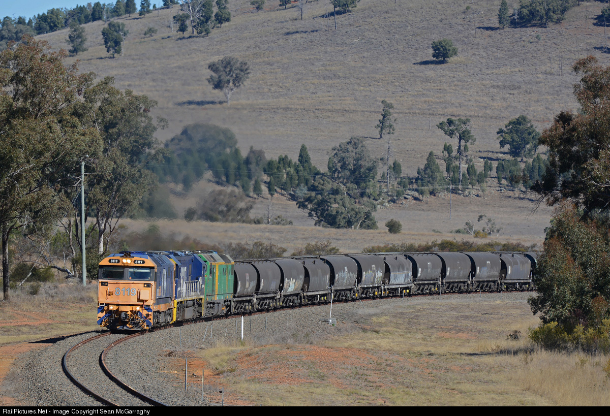 | An unusually busy (during daylight) cross country line between Dubbo And Merrygoen saw three movements in a matter of 3 hours on this morning. One of these was 8422N loaded grain led by 8119, 8227 & DL43 from Dubbo to Carrington. |