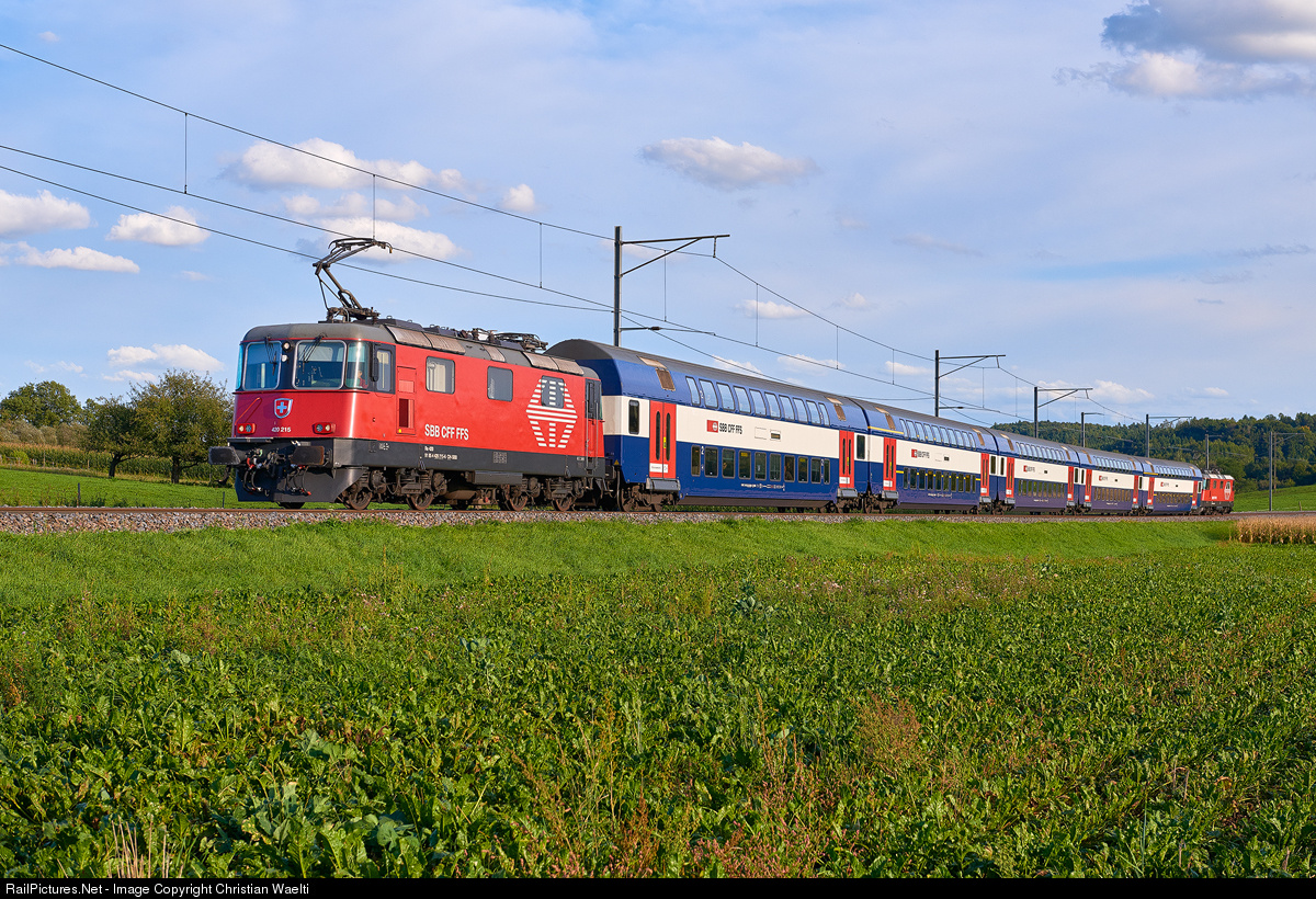 | Missing coach! Common HVZ consists (BiLevel trainsets for peak traffic) run push-pull with six coaches between two Re 420 LION electrics. For some reason, todays train 20364 from Winterthur to Schaffhausen exceptionally runs with only five BiLevels. Engines in consist are SBB Re 420 215 (front) and SBB Re 420 203 (rear). |