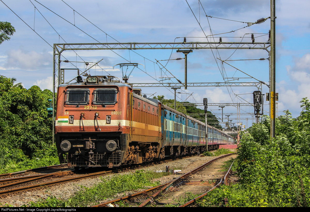 On a sunny evening after heavy rains, ERODE WAP-4 powering Ernakulam bound passenger train leaving Cherthala station