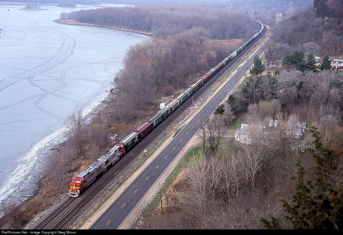 BNSF 784 leads a freight along Hwy 84 and the Mississippi River near Savanna, IL in December of 1997. This view is from the overlook in Palisades State Park.