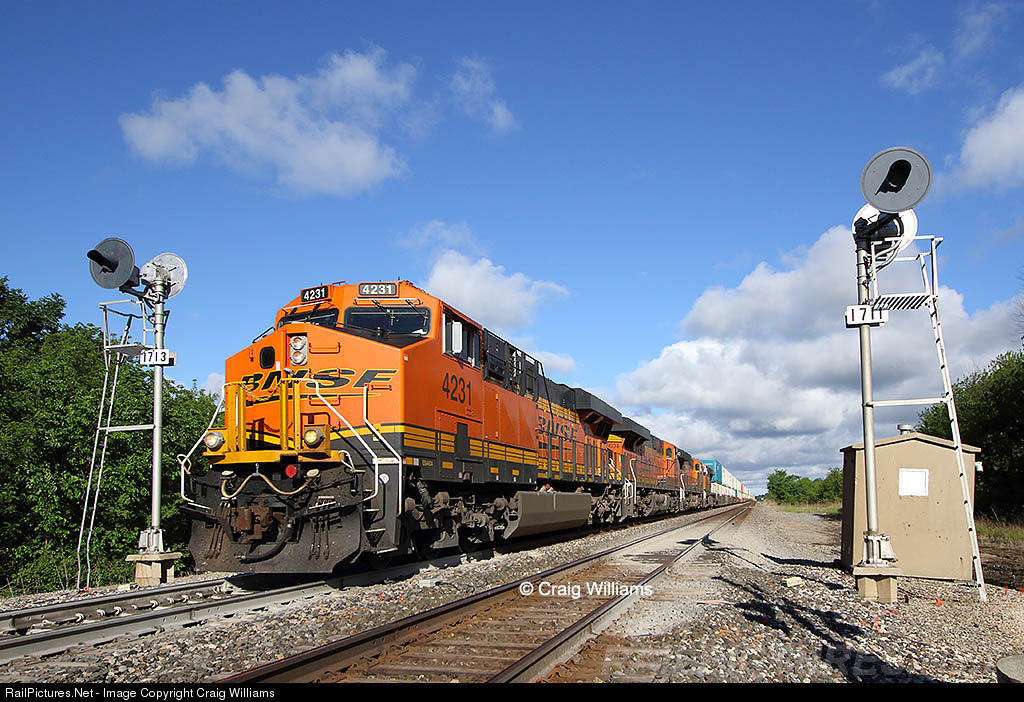The BNSF is working on replacing what's left of the ex-Santa Fe style signals east of Galesburg. Here the Stockton, CA, to Willow Springs, IL, Z-train blast by MP 171 and a pair of classic ex-Santa Fe style searchlight signals that are on their way out. Lots of orange markings on the ground here, so it wont be long! This is the 1st set east of the crossovers at Yost in East Galesburg.