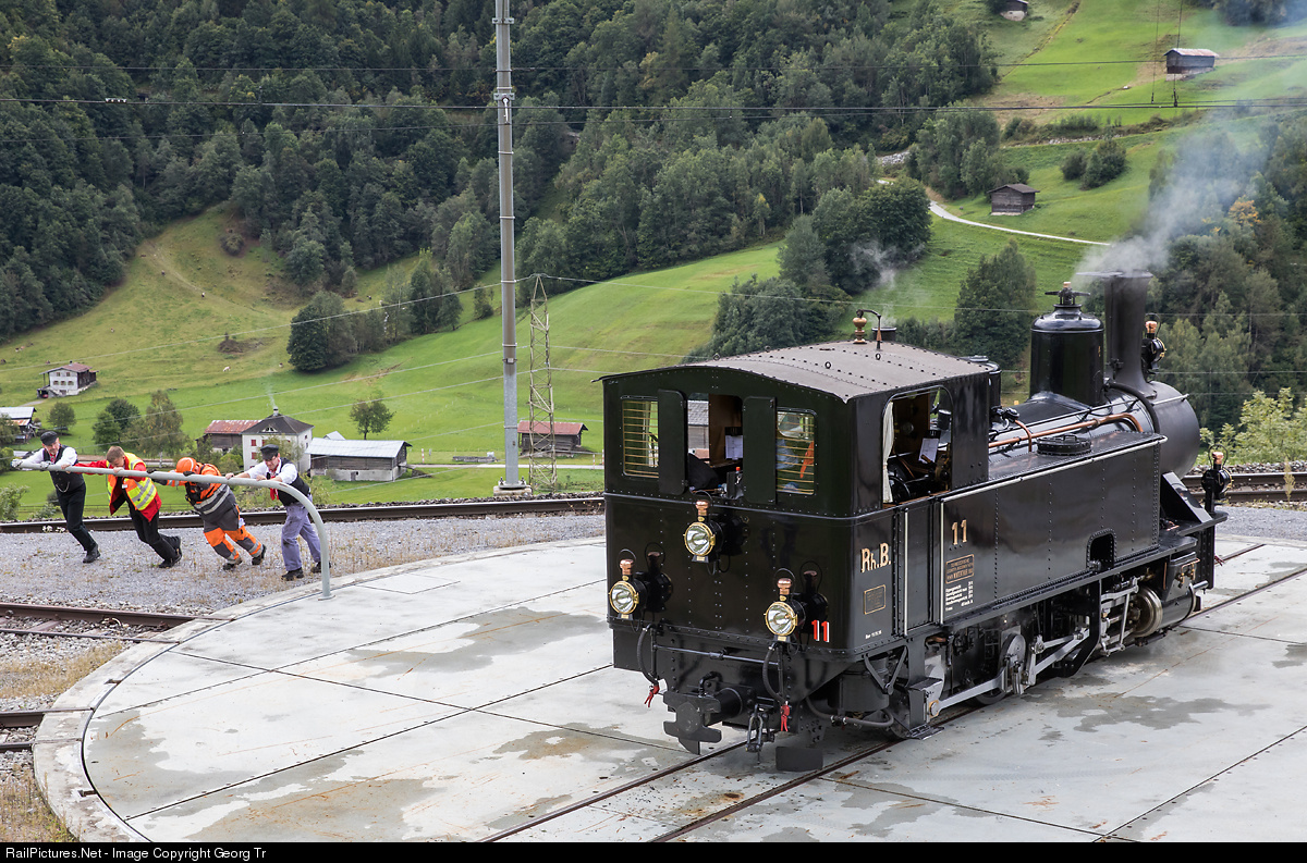 The light oil fired "Mogul" G 3/4 # 11 "Heidi" from 1902 is beeing turned on the modern turntable of Sumvitg-Cumpadials. This device was built new in 2002/2003, to replace the turntable of Disentis, which had to give way to the modernisation of the station.
