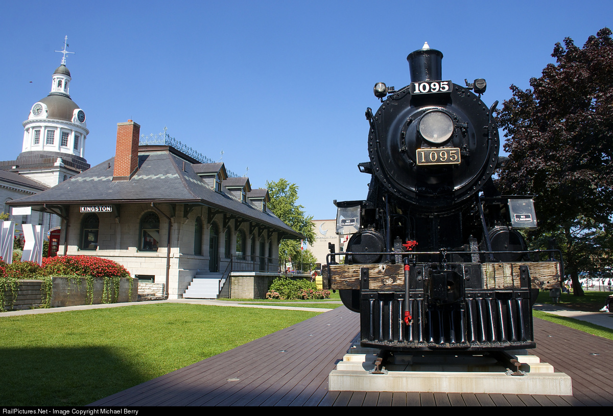 | Hometown steam engine. Built by the Canadian Locomotive Company in Kingston in 1913, 4-6-0 CP 1095 is preserved in its hometown by the waterfront along Lake Ontario. To the left is the former CP passenger station which now serves as a tourist bureau and further to the left is the City Hall. |