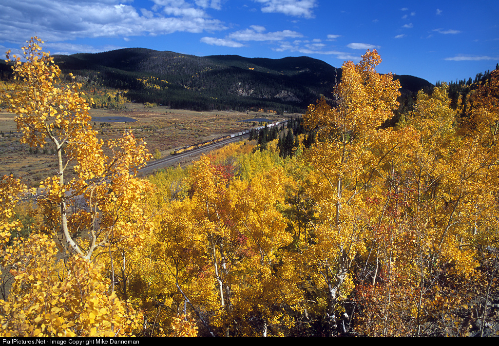 The golden colors of autumn are just about at their peak above Tolland, Colorado, on the morning of October 1, 2008. Union Pacific’s MDVRO manifest freight works upgrade with seven locomotives tugging away at the tonnage, which is composed of six GE AC4400CWs and a lone EMD SD9043MAC.