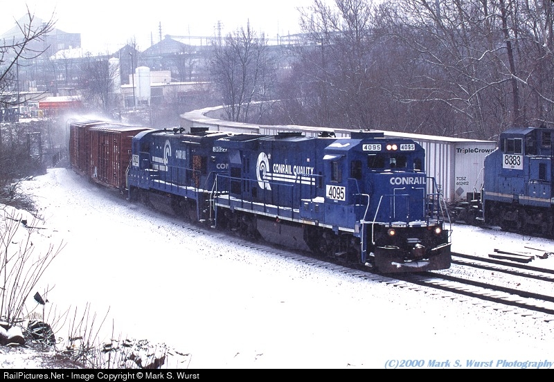 | All ex-Conrail power comes together in this scene, as an exx-MGA Super7 and a B36-7 leads an eastbound local past a parked Roadrailer with blue C40's. |