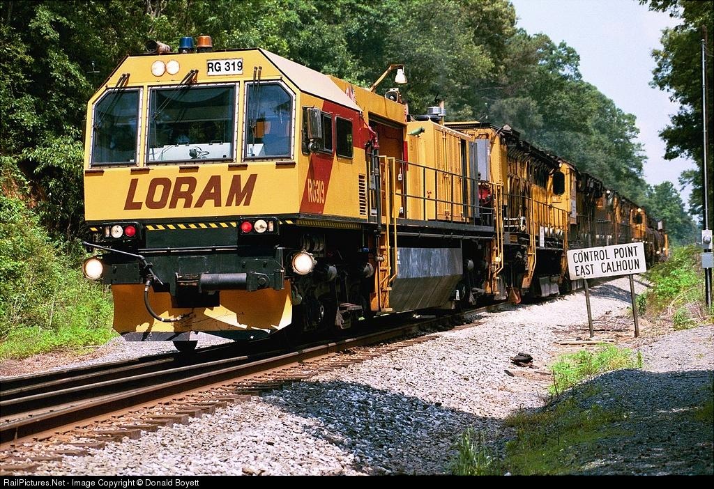 Loram rail grinder RG 319 is pulling into Calhoun siding on the KCS Vicksburg Sub.