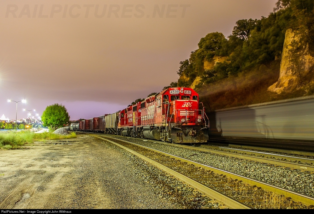 Stormy Night: Not quite enough time to make it into the yard, the "Soo Shakopee" job sits tied down on Soo 1 at West Hoffman, this as another Eastbound streaks past, heading for St. Paul Yard. It's a very stormy night, as evidenced by the trees, and the lightning in the backgound. Taken while off duty, wearing full PPE.