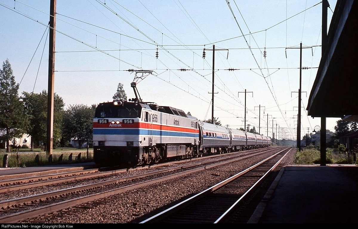 A relatively clean E-60, sans windshield grilles, heads north with "The Murray Hill." The train is on a 4-hour schedule from DC to New York, compared to the approximate 3-1/2 hour schedule of today's Northeast Regionals. The 956 was built by GE for Amtrak in October of 1975.
