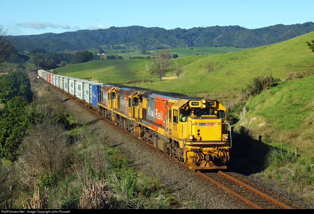 Trains on 3' 6" (1.067m) track from Whangarei to Bluff with virtually heritage rebuilt EMD and GE locomotives still the mainstay power. The network was privatized in 1990's and operated by Toll until 2008 when state owned KiwiRail was established.