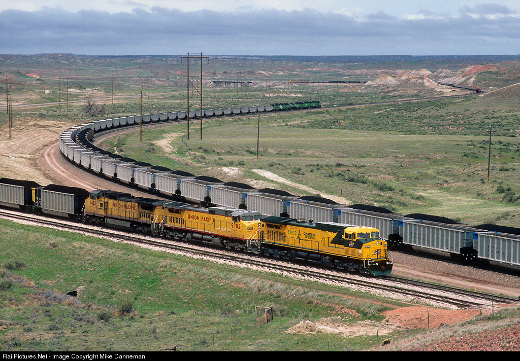 A Chicago & North Western coal train led by GE AC4400CW No. 8803 has just about finished loading at Antelope Mine at Converse Junction, Wyoming, on May 12, 1995. On Main 1 is the rear of a southbound C&NW coal train that has begun its climb of Logan Hill. On Main 2 is a northbound Burlington Northern empty heading for loading, which is closely following another C&NW empty that is about to cross the bridge over Antelope Creek. Busy times…
