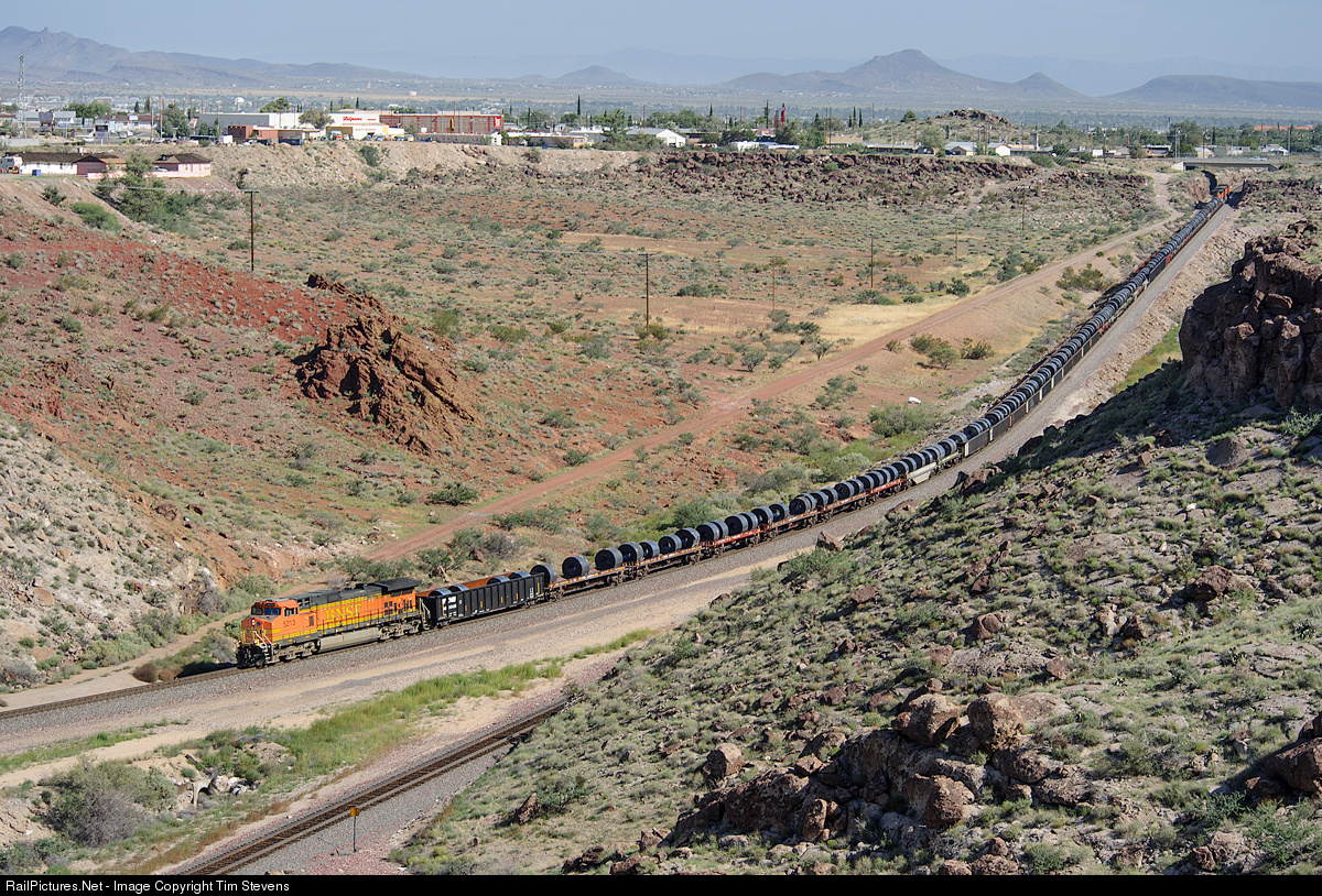 | BNSF C44-9W 5213 gingerly guides a loaded coil steel train downhill into Kingman, AZ. The train was destined for Pittsburg, CA. |
