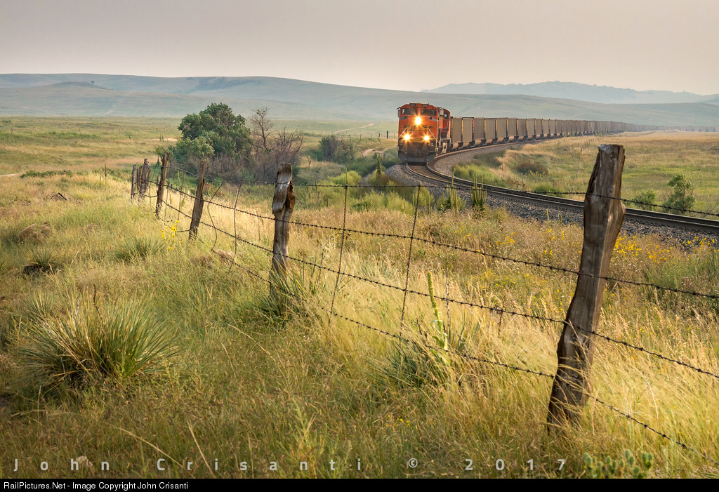 Due to wildfires burning in the Western United States across several states and also in Canada throughout a few Provinces, thick smoke clouds from such fires have moved into Colorado and as far east as Illinois and Ohio. The smoke has created unique atmospheric conditions throughout the state of Colorado, especially along the I-25 urban corridor from Colorado Springs to Fort Collins. Seen here, a northbound BNSF empty coal train led by SD70ACe No. 9218 races down the grade along Main 2 from the Palmer Divide at Greenland, Colorado on September 4, 2017.