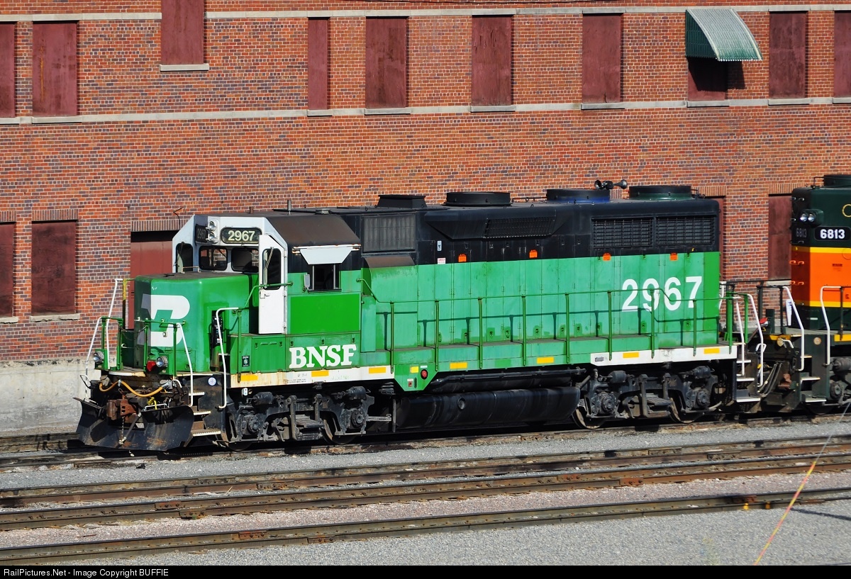 | BNSF 2967 was built in 1964 as a GP35 for the Louisville & Nashville Railroad, and was rebuilt later into a GP39V. Although a bit faded, it represented well the Burlington Northern fleet that was slowly assimilated after the merger. |