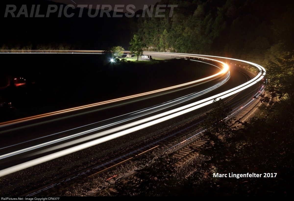 NS 16N rolls downgrade at Horseshoe Curve while 655 climbs upgrade in a 6 minute exposure.