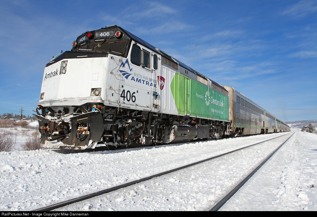 Amtrak’s Winter Park Express ski train lays over in the siding at Fraser, Colorado, on January 7, 2017. The train takes skiers from Denver to Winter Park in the morning, with the empty train laying over here, returning to Denver Union Station in the evening. Amtrak EMD NPCU No. 406 and three Amtrak Superliners—one coach and two coach/baggage cars—were specially-wrapped by sponsor CenturyLink for the train that operated Saturdays and Sundays in January to March 2017. The train is returning for the 2018 season.