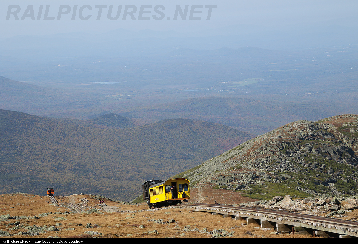 | Two of the Mount Washington Cog Railway's bio diesel locomotives can be seen ascending the the mountain just before reaching the summit. A third locomotive and car is just out of view. Due to the busy day the 12:30 departure had three sections. The railroad was opened in 1869 and began running diesel locomotives in 2009. One train per day powered by steam still ascends the mountain during peak seasons. |